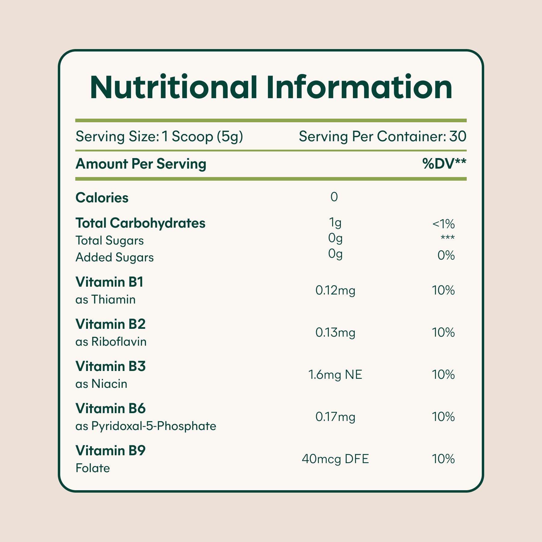 Vitamin B1 (Thiamin), Vitamin B2 (Riboflavin), Vitamin B3 (Niacin), Vitamin B6 (Pyridoxal 5 Phosphate), Vitamin B9 (Folate), Vitamin B12 (Methylcobalamin), Calcium (Calcium Citrate), Magnesium (Magnesium Citrate), Sodium (Sodium Citrate), Potassium (Potassium Citrate), Polydextrose, Citric Acid, Natural Artificial Flavors, Sucralose, Calcium Silicate, Fruit Vegetable Blend (for color).